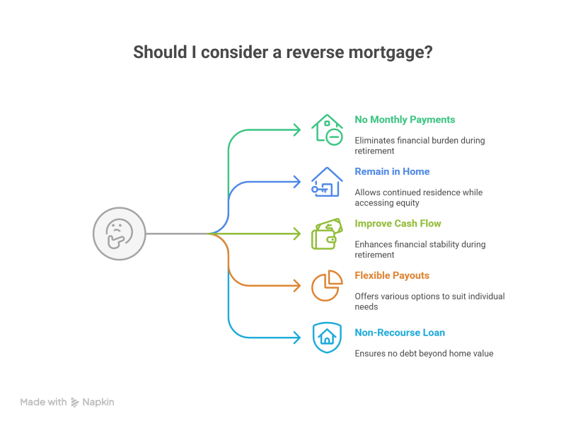 - Reverse mortgages can offer immediate financial relief by eliminating monthly payments, supporting those who want to age in place.