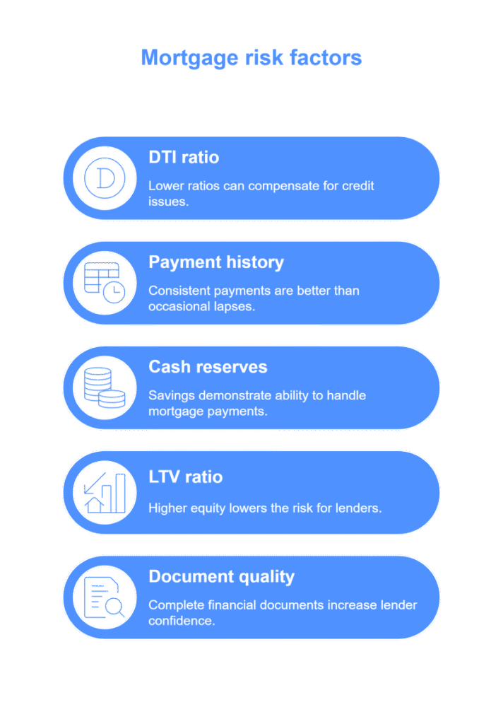 - Debt-to-Income (DTI) ratio – lower ratios offset weaker credit.